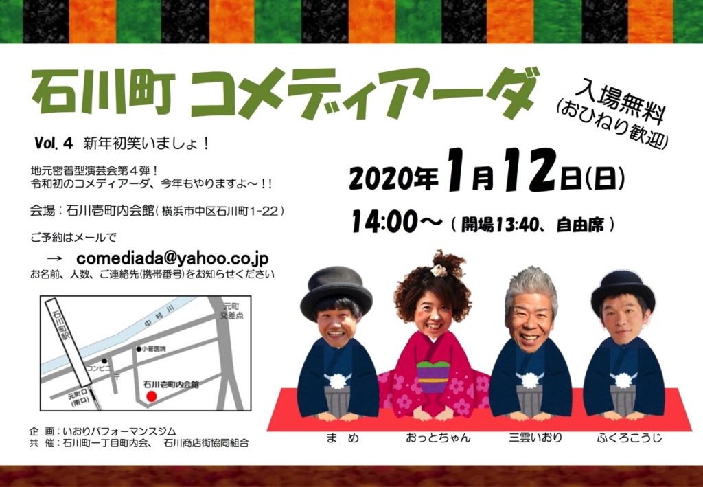 石川町コメディアーダvol.4 新年初笑いましょ! その他 2020.01.032020.03.04 石川町コメディアーダvol.4 新年初笑いましょ! 日時 2020年1月12日(日) 14:00開演(13:30開場) 会場 石川壱町内会館 出演者 三雲いおり おっとちゃん まめ ふくろこうじ 入場料 入場無料(おひねり歓迎)