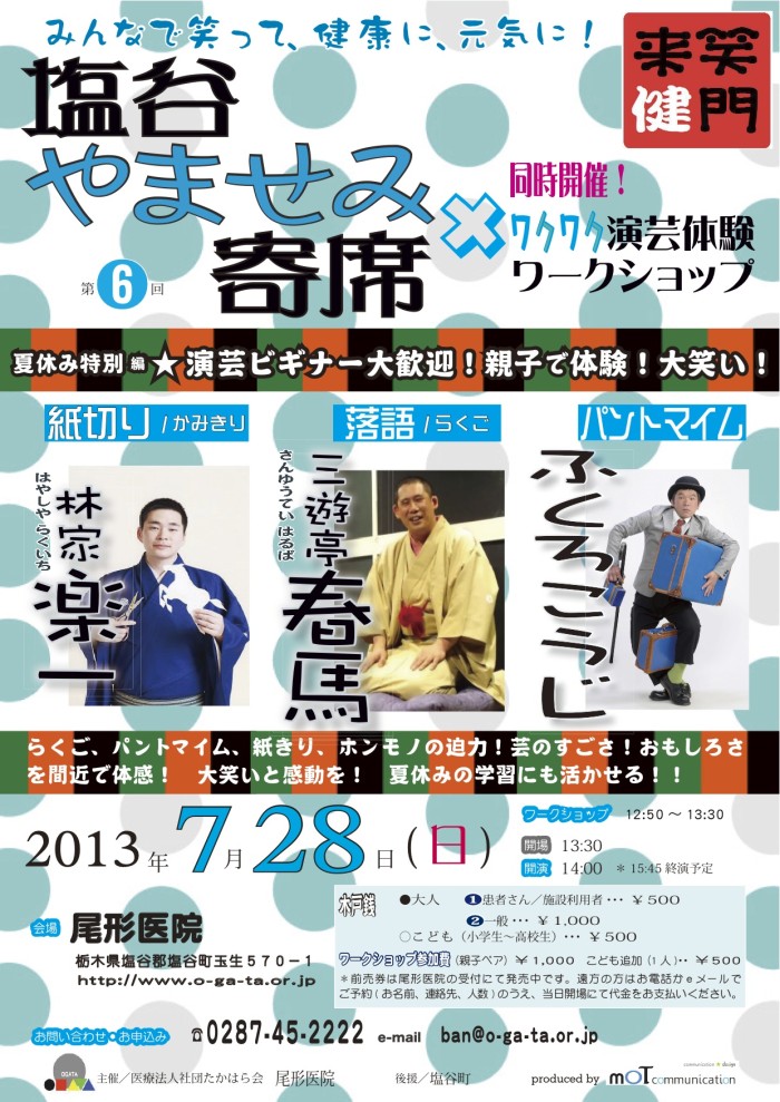 第6回塩谷やませみ寄席 舞台 2013.07.282013.08.20 第6回塩谷やませみ寄席 日時 2013年7月28日(日) 開場 13:30 開演:14:00 会場 尾形医院 栃木県塩谷郡塩谷町玉生570−1 問い合わせ 尾形医院 0287−45−2222 木戸銭 大人 施設利用者 500円 一般 1,000円 子ども 500円 出演 三遊亭春馬:落語 林家楽いち:紙切り ふくろこうじ:クラウン 落語、紙切り、パントマイムのワークショップも行います。 私はパントマイム担当です。
